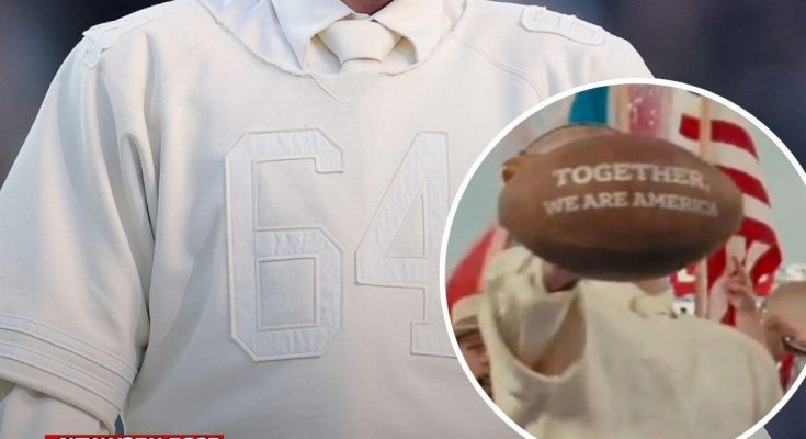 “God bless America,” he said in the finale of his performance at Levi’s Stadium in Santa Clara, Calif, before listing off the countries in South and Central America and holding up a football that read, “Together we are America.”