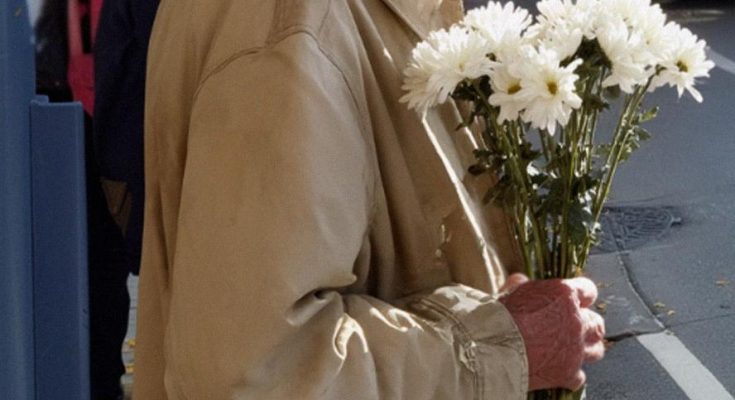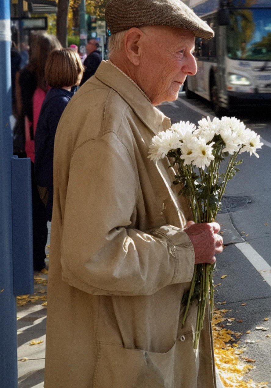 An elderly man stood near the curb, slightly hunched, holding a small bouquet of daisies wrapped in clear plastic. His coat was too big for his frame. The fabric had a worn, washed-too-many-times look, faded from what might’ve been navy to something closer to a sad blue-gray.